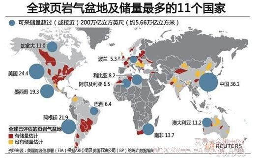 頁(yè)巖的滲透率很低,在以往都不具有商業(yè)開采價(jià)值,直到儲(chǔ)層壓裂技術(shù)(將地下儲(chǔ)層壓出裂縫,改善滲透率)的迅速發(fā)展,頁(yè)巖氣開發(fā)逐漸變得普遍。全球頁(yè)巖氣儲(chǔ)量有450萬億立方米,其中35%在美洲,35%在亞太地區(qū),其余15%在中東地區(qū)。我國(guó)頁(yè)巖氣資源潛力大,初步估計(jì)我國(guó)頁(yè)巖氣可采資源量在36.1萬億立方米,與常規(guī)天然氣相當(dāng),居世界第一位。